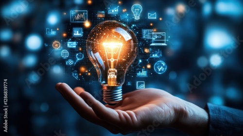 Businessman Hand holding Light bulb with a laptop. Glowing icons of global, internet, connection, technology, digital, marketing, financial, banking, innovation, application, data etc are around bulb
