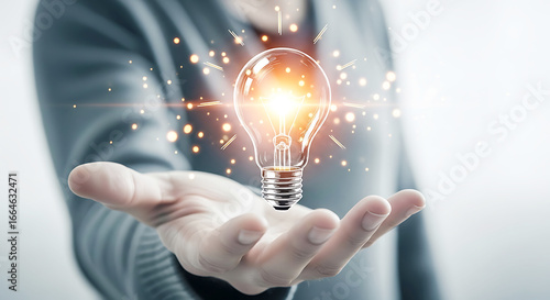 Hand holding a glowing lightbulb symbolizing a brilliant idea and innovation