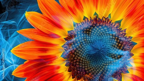 A sunflower with blue and orange smoke in the background, and a red and yellow flower in the foreground