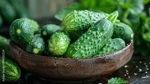 Wooden table holds wooden bowl of green cucumbers and nearby leaf pile