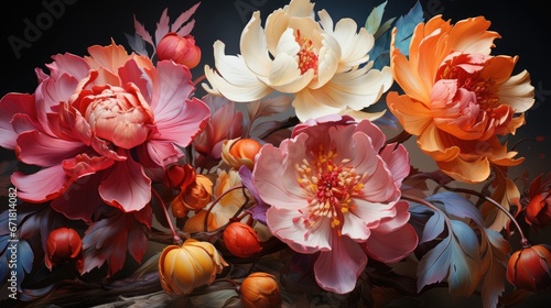 a close up of a bunch of flowers with leaves and flowers in the middle of the picture, with a black background. generative ai