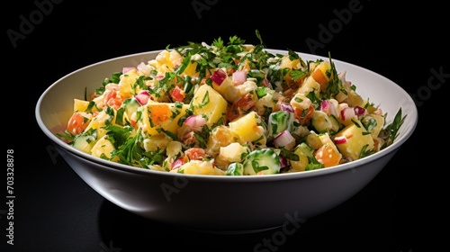 a close up of a salad in a bowl on a black table with a black back ground and a black background.