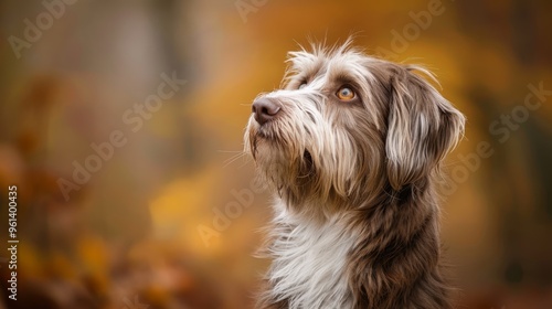 A tight shot of a canine's countenance surrounded by a hazy backdrop of trees and foliage