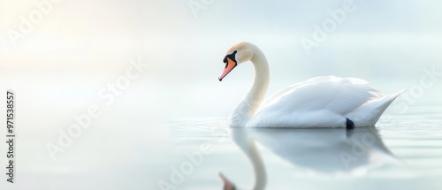 A white swan floats serenely atop the water, near a long-necked bird with an orange beak