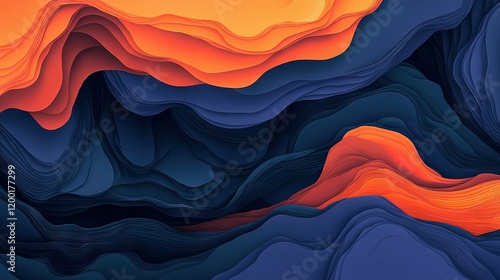 Abstract image of mountain range with orange-blue layers in foreground, orange sky in background