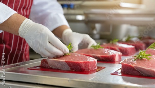 Meat or steak production line with hands of a worker wearing latex protective gloves