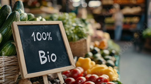 "100% bio" sign on vegetable rack at street vegetable stand at village market