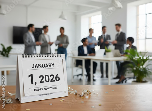 2026 new year calendar end goal year meeting celebration in modern office with desk calendar showing January 1 2026 happy new year confetti and colleagues planning future together