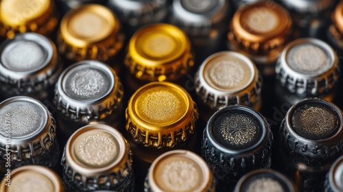 28.Close-up of metallic bottle caps with vintage style designs for beverages, including gold, silver, and copper-toned caps, displayed in a well-lit, minimal background.