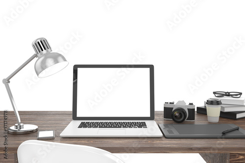 3D illustration laptop and work stuff on table near brick wall, Workspace