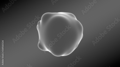 3D illustration of a sphere of irregular shape with a wavy, swollen surface. The sphere glows in a dark space against a gray gradient. 3D rendering, abstract background.