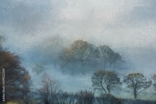 A Bamford Edge digital oil painting of trees and mist in the Peak District, UK.