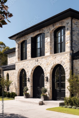 A beautiful building featuring a stunning stone exterior and expansive windows, nestled in a serene residential neighborhood, basking in the bright daylight under a clear sky