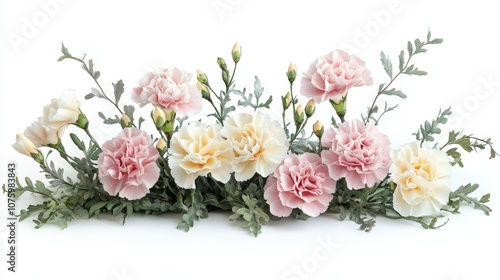 A beautiful floral arrangement featuring carnations in soft pastel shades, set against a background of greenery