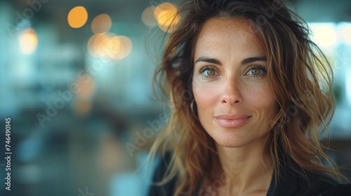 a beautiful latin business woman in her 40s in a tech office with data background in a desk