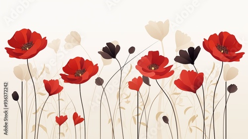 A beautiful minimalistic illustration of red poppy flowers with delicate stems and leaves, set against a soft beige background.
