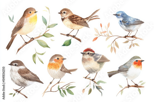 A beautiful watercolor set of small garden birds, like sparrows, finches, and robins, painted in soft, natural tones. The birds are isolated on a white background, perfect for elegant, nature-inspired