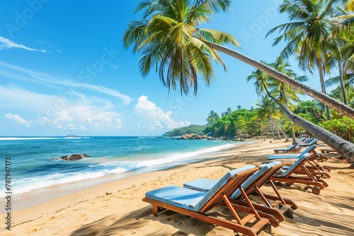 A beautiful wide open sandy beach with beach beds, summer concept.