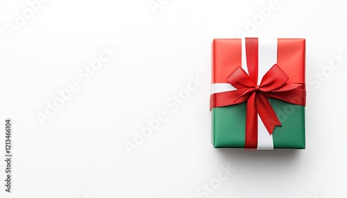 A beautifully wrapped Christmas gift with a red and green design, placed on a clean white surface
