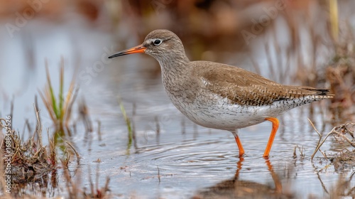 A bird with brown and white plumage stands in shallow water among wetland plants. The scene captures the bird's focused demeanor during a tranquil spring day.