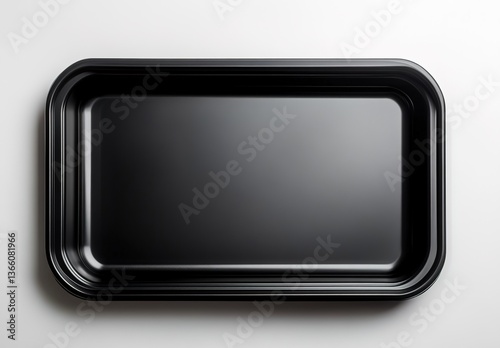 A black tray on a white background, with a smooth reflective surface and rounded edges, minimalist and modern style, soft lighting, exuding a clean and elegant feel.