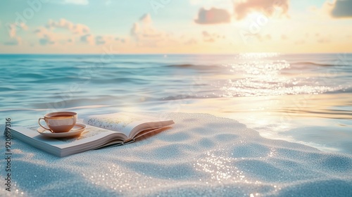 A book and coffee cup on sandy beach by the ocean at sunrise