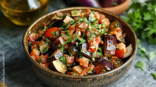 A bowl of eggplant salad with tomatoes and herbs on a textured surface with oil in the background