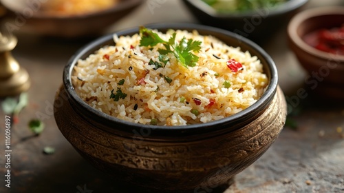 A bowl of fragrant rice garnished with herbs, served as a delicious meal.