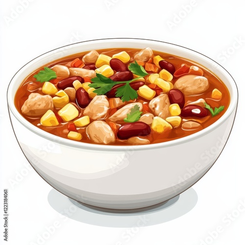 A bowl of hearty turkey chili with beans and corn, isolated white background, minimalist art style