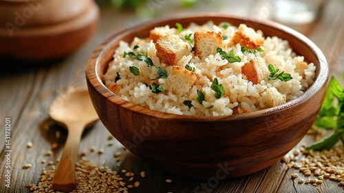 A bowl of rice with croutons and herbs on a wooden table, scattered grains and mint leaves.