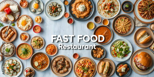 A bright and inviting flat-lay image showcasing a variety of fast-food dishes, emphasizing diverse flavors and cuisines