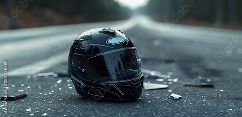 A broken black motorcycle helmet lying on the side of an empty road, suggesting a past accident or potential danger, and emphasizing the importance of safety gear for riders.