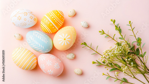 a bunch of flowers and painted eggs on a pink surface