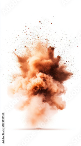 A burst of red-brown powder explodes against a white background, creating a dramatic and abstract image.