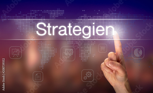 A businessman pressing a Strategy "Strategien" button in German on a futuristic computer display