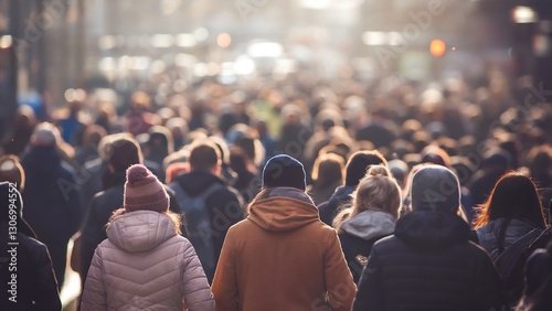 A bustling city street filled with people walking under warm, golden sunlight