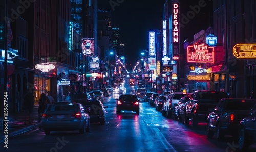 A bustling city street in Nashville, Tennessee, illuminated by vibrant neon signs and streetlights at night