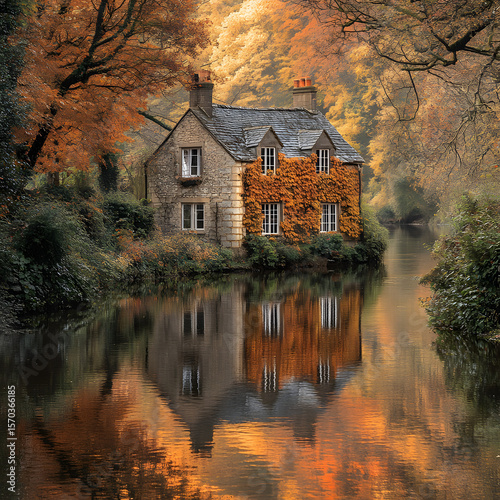 A calm river reflecting brilliant autumn trees and an ivy-covered stone cottage on the far bank, golden and crimson leaves surrounding the scene, warm afternoon glow, perfect mirror effect.