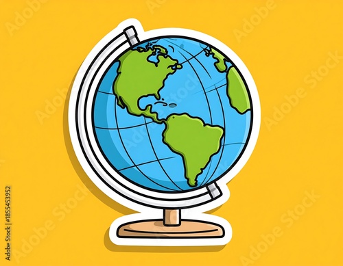 A cartoon-style globe graphic featuring continents in green, oceans in blue, a white border, and a stand, all on a yellow background