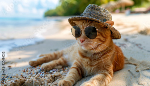 A cat wearing sunglasses and a straw hat is sitting on a rock by the water by AI generated image