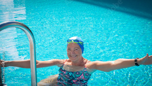 A cheerful senior woman doing sport in the outdoor swimming pool under the sun. Blue swim cap and goggles. Healthy lifestyle of one retired people