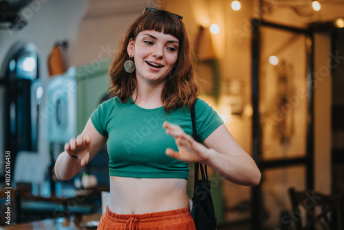 A cheerful young woman in a green top and orange pants is expressing joy in a trendy indoor environment with warm lighting.