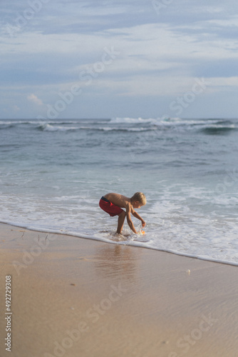 A child on the beach plays in the waves of the ocean. Boy on the ocean, happy childhood. tropical life.
