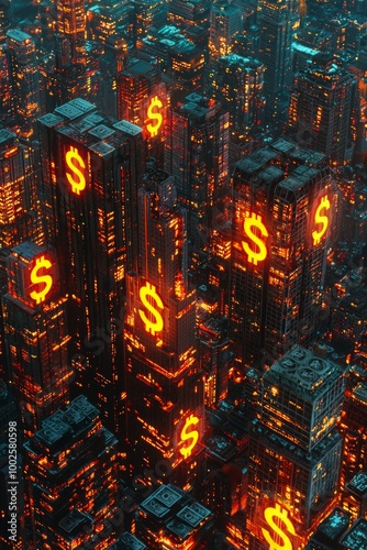 A cityscape of skyscrapers with glowing dollar symbols on their facades, aerial view, cyberpunk style.