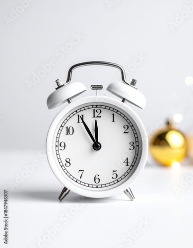 A classic white alarm clock, with hands precisely at twelve, brilliantly captures the concept of a new beginning, a festive countdown, and the optimistic promise of a fresh start for the new year