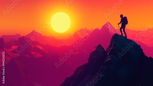 A climber reaching the summit of a rugged mountain as the sun sets, representing triumph over adversity and the power of perseverance.