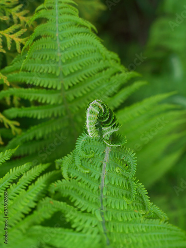 A close up of a eagle fern Bracken fiddlehead against a green bush background