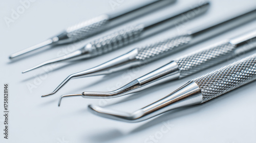 A close up of several metal dental tools arranged on a white surface in a studio setting, sharp focus