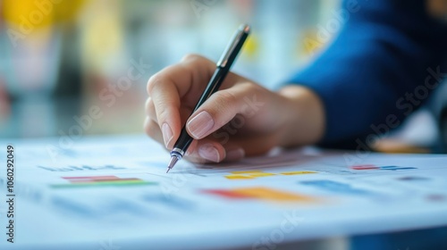 A close-up of a hand holding a pen and writing on a document with graphs.