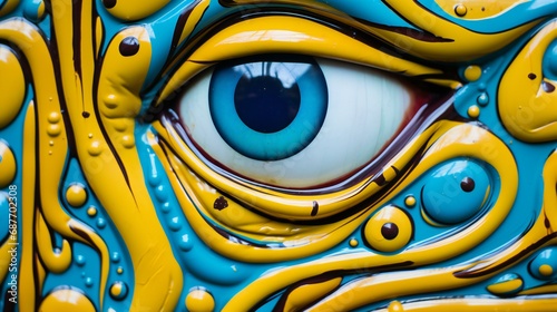 A close-up of a person's eye, showcasing intricate details, colors, and cultural elements